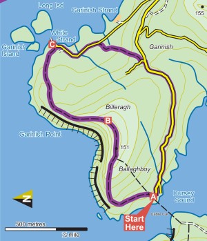 B-C. The loop now descends across open ground toward Garinish Point and gives you close up views of Garanish Island and Long Island before exiting a small gate and reaching the quay at Garinish. Turn right here.